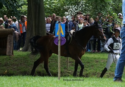Nach der Dressur fanden die beiden Geländeprüfungen statt und eine Völkerwanderung setzte in den hinteren Teil des Schlossparks ein. Verzweifelt suchte ich die Geländeskizze für die U25-Wertungsprüfung auf der Veranstalterwebseite, fand keine und ein Mitarbeiter an der Strecke meinte, sie unterscheidet sich nicht so arg von der Event Rider Masters-Prüfung. Also lief ich als erstes zur Startbox, um dort Katharina Schedel auf einer teilweise vor Aufregung steigenden Carla zu sehen.