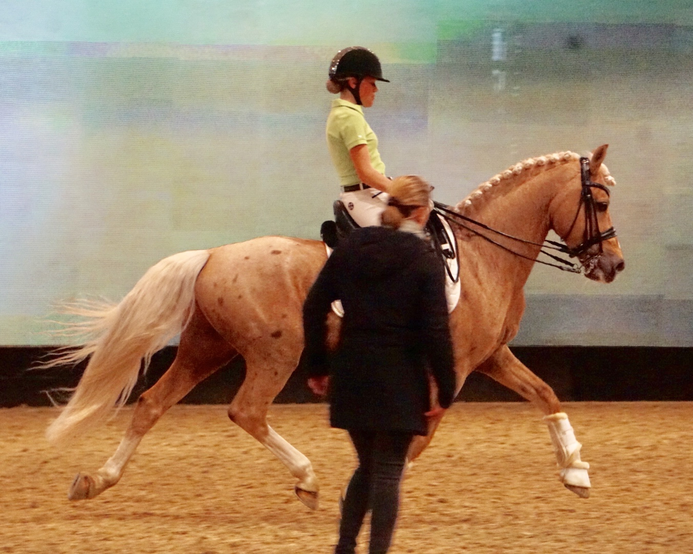Insbesondere bei der vierten Reiterin war einiges nicht optimal, woran gearbeitet wurde. Das Pferd war sehr unzufrieden, peitschte mit dem Schweif und drückte die Zunge raus. Isabell Werth schnallte die Zäumung anders ein. Ich hoffe doch mal lockerer. Später sollte die Reiterin einhändig reiten, weil ihr hübscher Palomino mehrfach blockierte und den Rückwärtsgang einlegte. Weg von der Hand war die Devise und das Pferd lief wesentlich frischer und zufriedener durch die Halle.