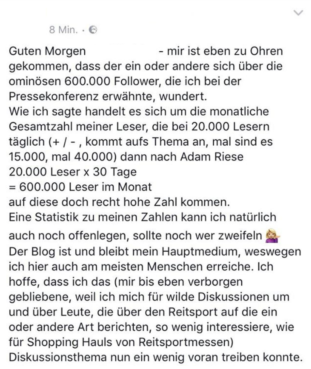 Daraufhin hat die Reitsport-Bloggerin (ich schreibe den Namen absichtlich nicht hin) auf Facebook, Instagram und in ihrer Instagram-Story (vielleicht auch auf Snapchat, das habe ich wenn dann nicht gesehen) das Thema nochmal öffentlich angesprochen und die Diskussion voran getrieben.