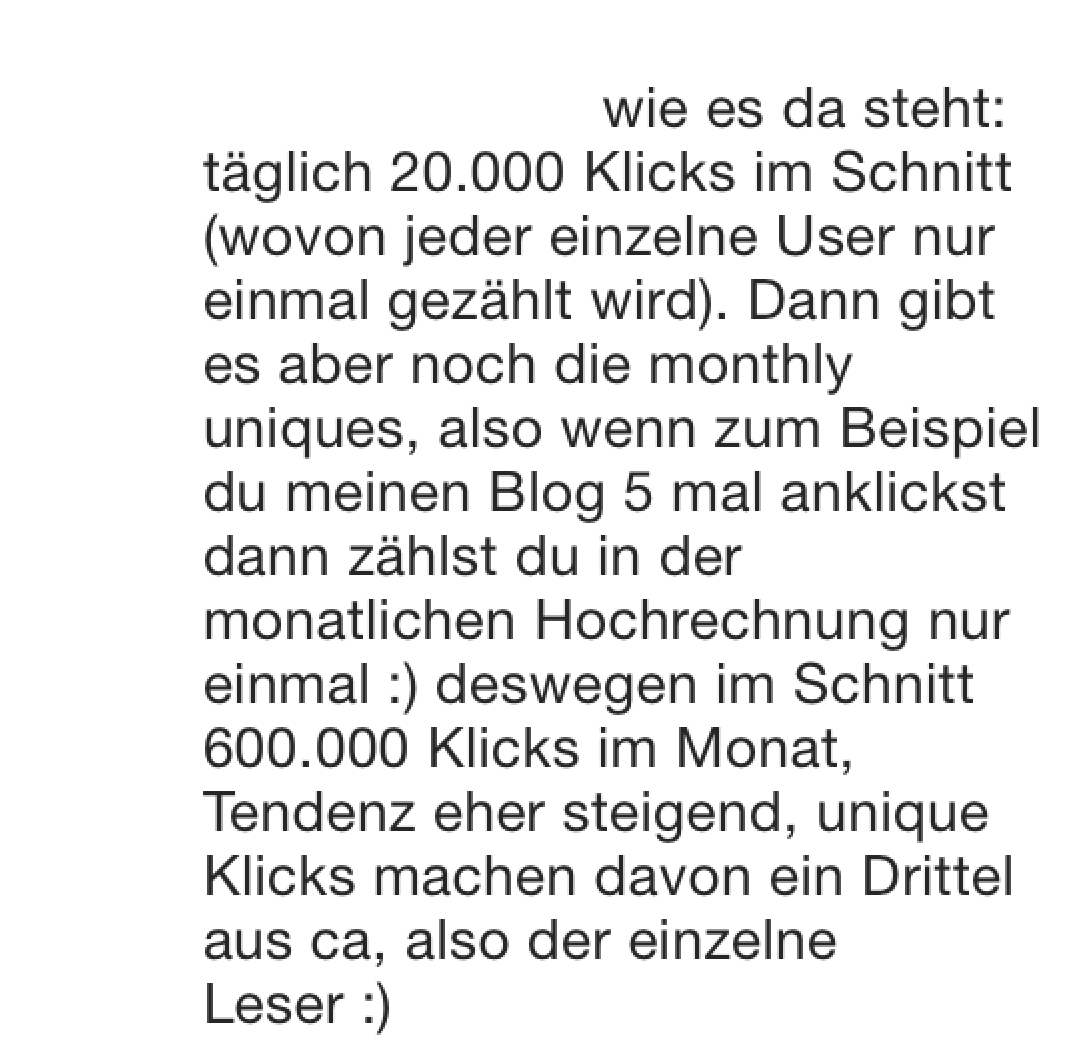 Okay, sie schreibt es sind also ca. 20.000 Blog-Leser bzw. Klicks pro Tag und somit 600.000 Leser bzw. Klicks im Monat. Da drückt sie sich leider etwas unklar aus. Die Tendenz der Besucher/Klicks soll steigend sein.